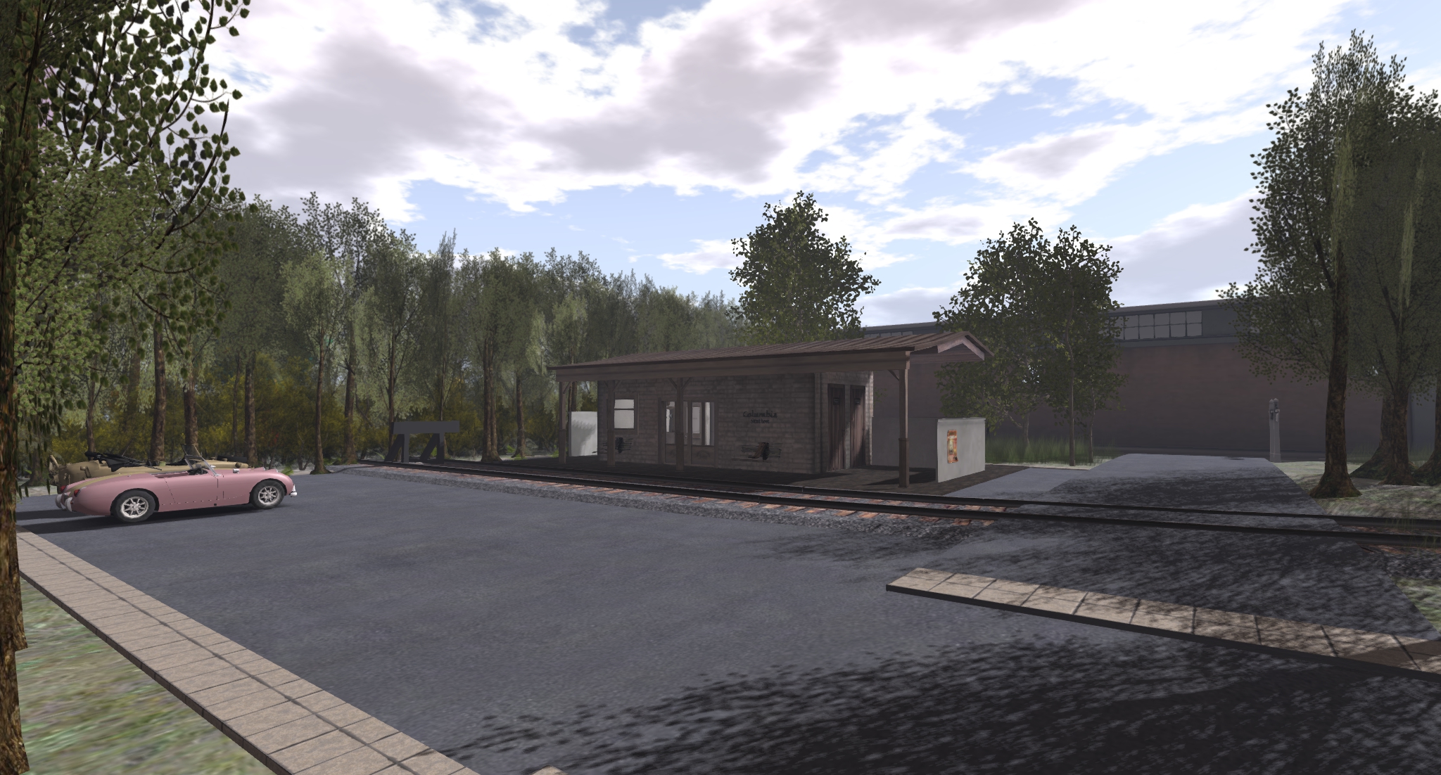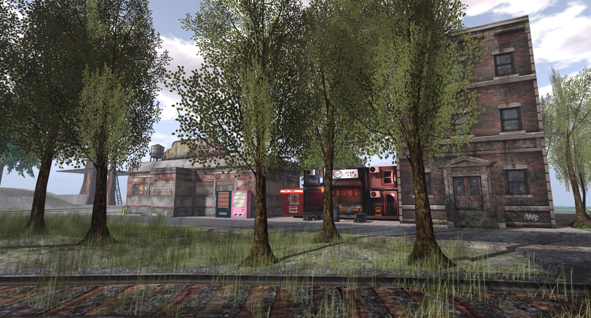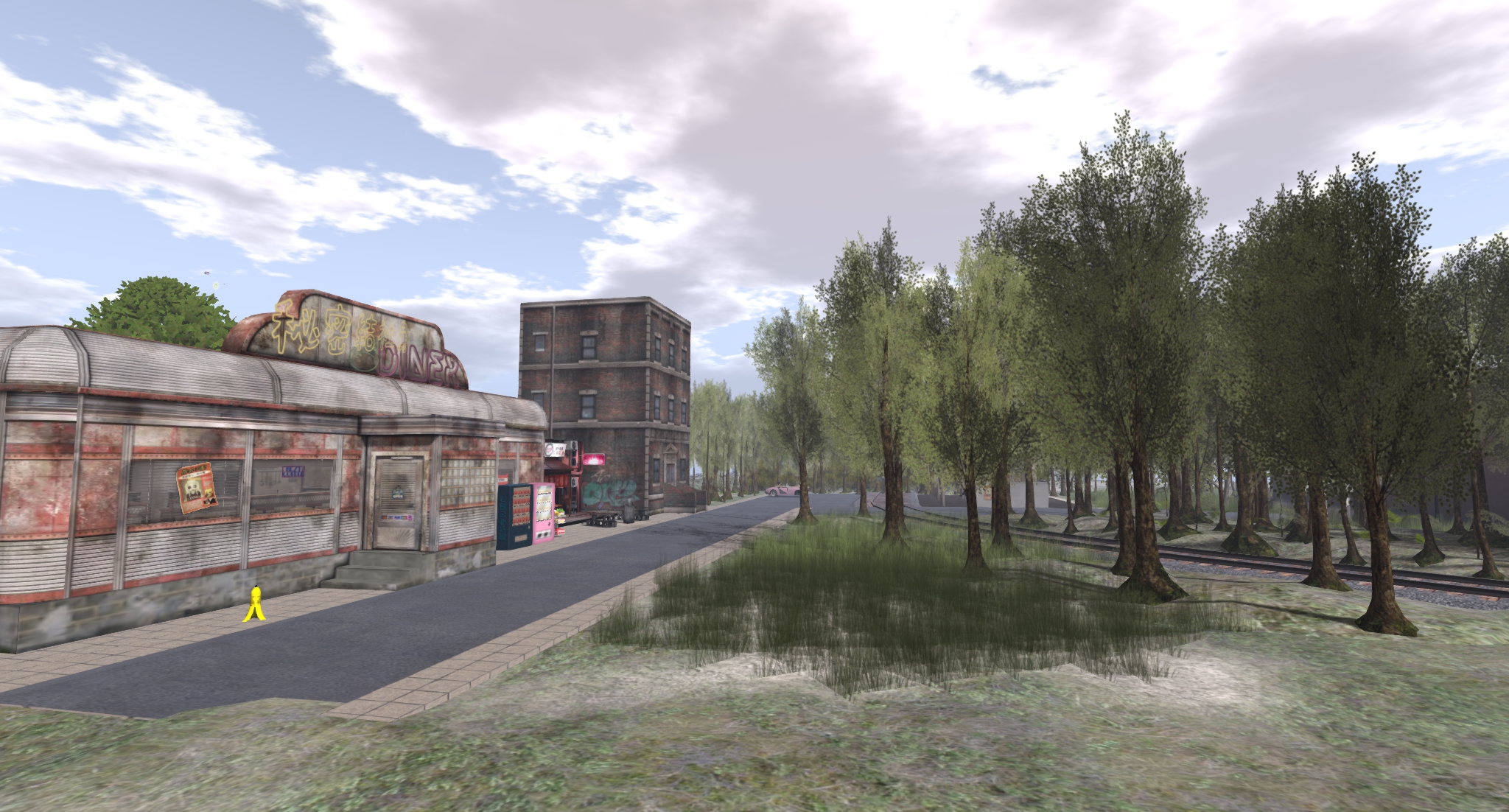 上から見た図。右側にKMH本店。SLRR本線からの引き込み線路の先に私設のColumbia駅。線路を隔てて秘密結社ダイナーと秘密結社鳥、埼陽軒、焼き鳥屋ピヨピヨ。ってな感じで。もう少し植林や飾り付けをしたかったのですが、重くなるのが嫌なのでこれ以上はやめておきます。北大陸にお住まいの方は車でも電車でもご来店可能でリンデンのRezゾーンも敷地前にあるので(線路ポイント切替信号機あたり)、近くまでお越しの際はお立ち寄りくださいませ〜(なーんつってな)